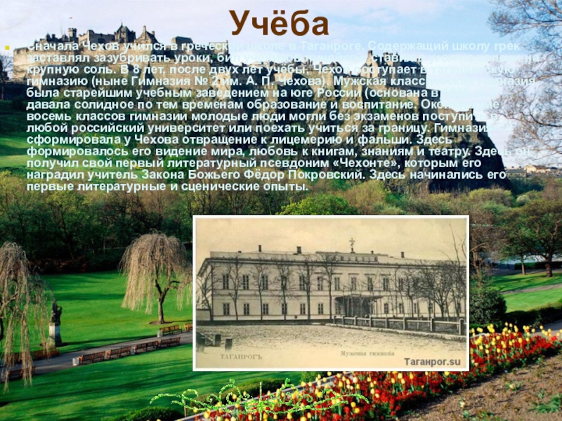 Сначала Чехов учился в греческой школе в Таганроге. Содержащий школу грек