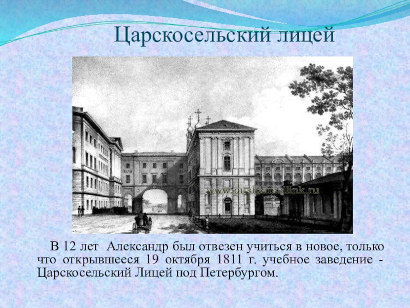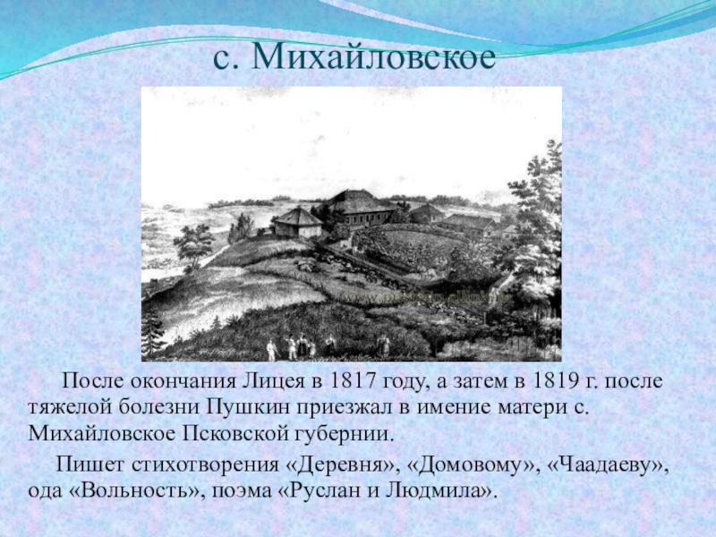 После окончания Лицея в 1817 году, а затем в 1819 г. после тяжелой болезни Пушкин приезжал в имение матери с.Михайловское Псковской губернии.