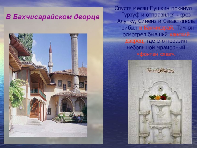 Симеиз и Севастополь прибыл в Бахчисарай. Там он осмотрел бывший ханский дворец, где его поразил небольшой мраморный «фонтан слез».