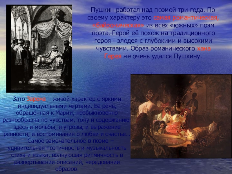 Зато Зарема – живой характер с яркими индивидуальными чертами. Её речь, обращённая к Марии, необыкновенно разнообразна по чувствам, тону и содержанию: здесь и мольбы, и угрозы, и выражение ревности, и воспоминания о любви и счастье…