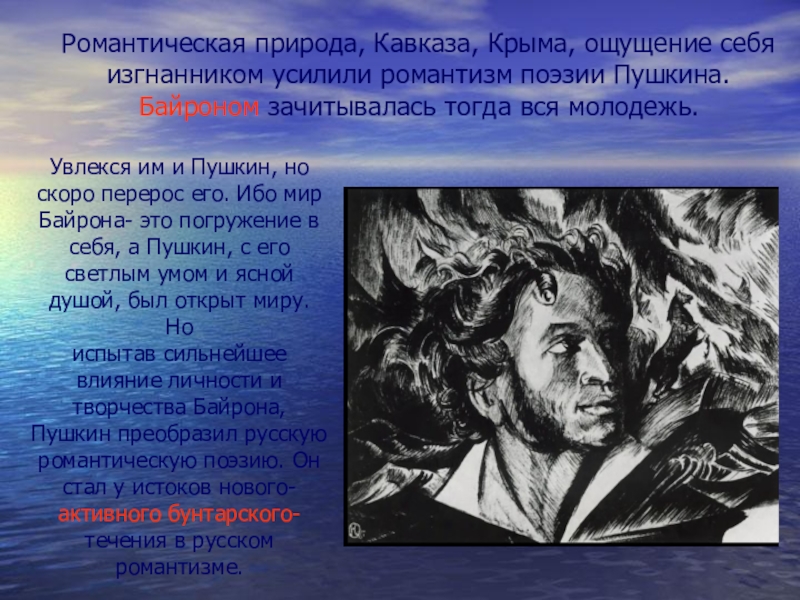 Романтическая природа, Кавказа, Крыма, ощущение себя изгнанником усилили романтизм поэзии Пушкина. Байроном зачитывалась тогда вся молодежь.