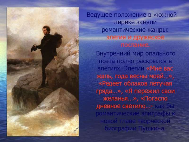 Внутренний мир опального поэта полно раскрылся в элегиях. Элегии «Мне вас жаль, года весны моей…», «Редеет облаков летучая гряда…», «Я пережил свои желанья…», «Погасло дневное светило…- как бы романтические эпиграфы к новой главе творческой биографии Пушкина.