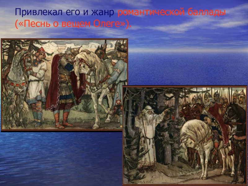 Слайд 12Привлекал его и жанр романтической баллады («Песнь о вещем Олеге»).