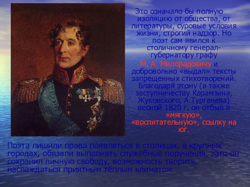 М. А. Милорадовичу и добровольно «выдал» тексты запрещенных стихотворений. Благодаря этому (а также заступничеству Карамзина, Жуковского, А.Тургенева) весной 1820 г. он отбыл в «мягкую», «воспитательную», ссылку на юг.