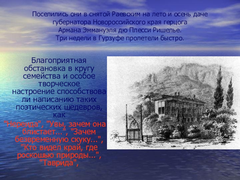 Слайд 9Поселились они в снятой Раевским на лето и осень даче губернатора