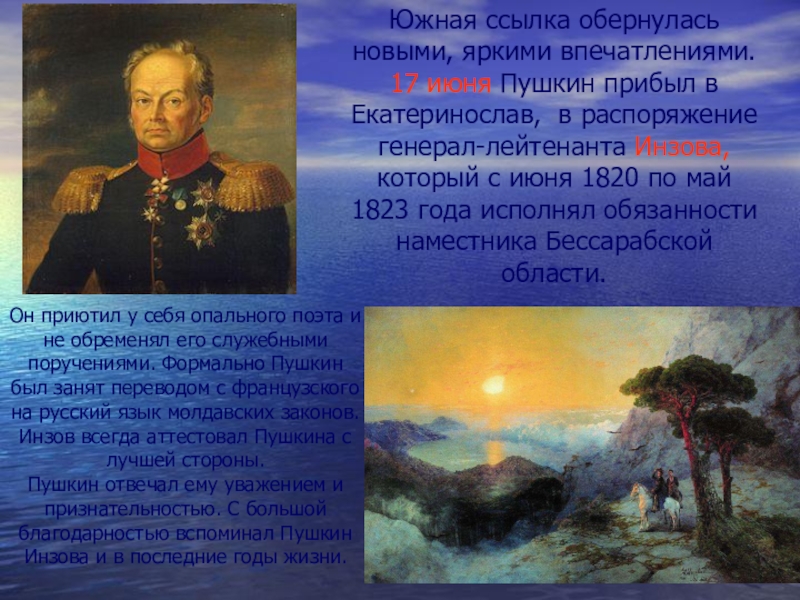 Он приютил у себя опального поэта и не обременял его служебными поручениями. Формально Пушкин был занят переводом с французского на русский язык молдавских законов. Инзов всегда аттестовал Пушкина с лучшей стороны.