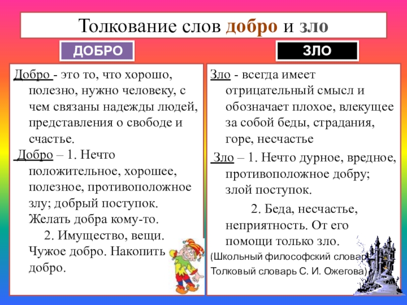 Зло - всегда имеет отрицательный смысл и обозначает плохое, влекущее за собой беды, страдания, горе, несчастье