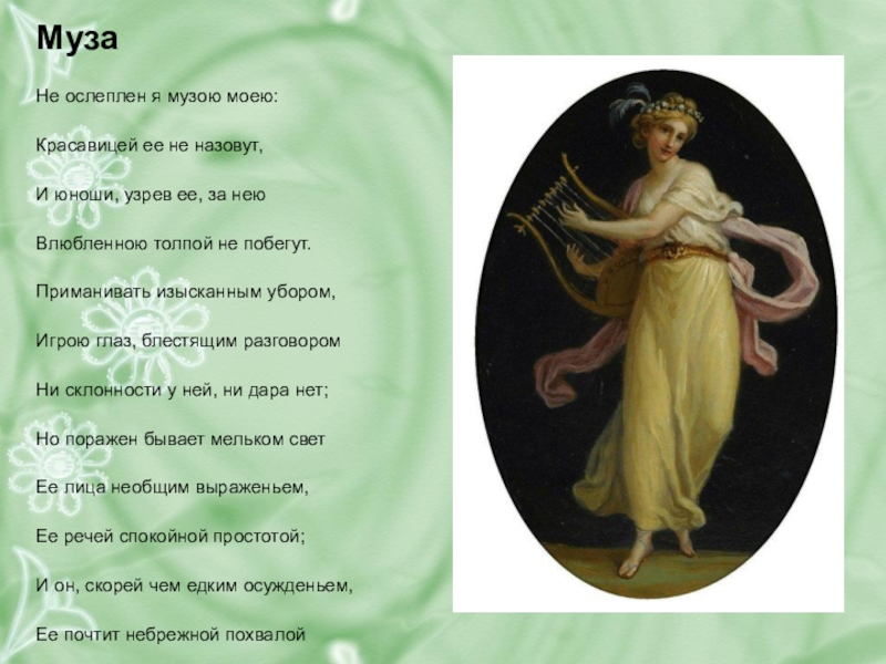 МузаНе ослеплен я музою моею:Красавицей ее не назовут,И юноши, узрев ее, за неюВлюбленною толпой не побегут.Приманивать изысканным