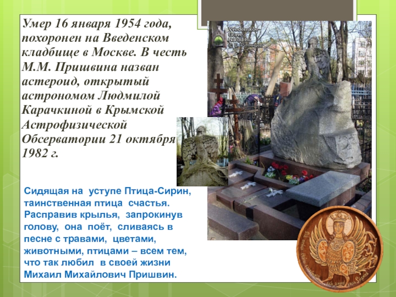 Сидящая на уступе Птица-Сирин, таинственная птица счастья. Расправив крылья, запрокинув голову, она поёт, сливаясь в песне с травами, цветами, животными, птицами – всем тем, что так любил в своей жизни Михаил Михайлович Пришвин.