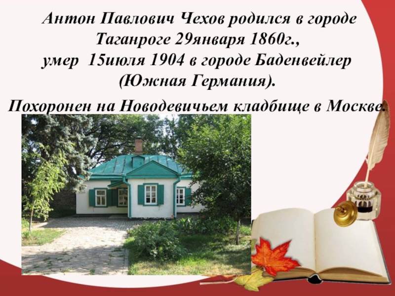 Антон Павлович Чехов родился в городе Таганроге 29января 1860г., умер 15июля 1904 в городе Баденвейлер (Южная Германия). Похоронен на Новодевичьем кладбище в Москве.