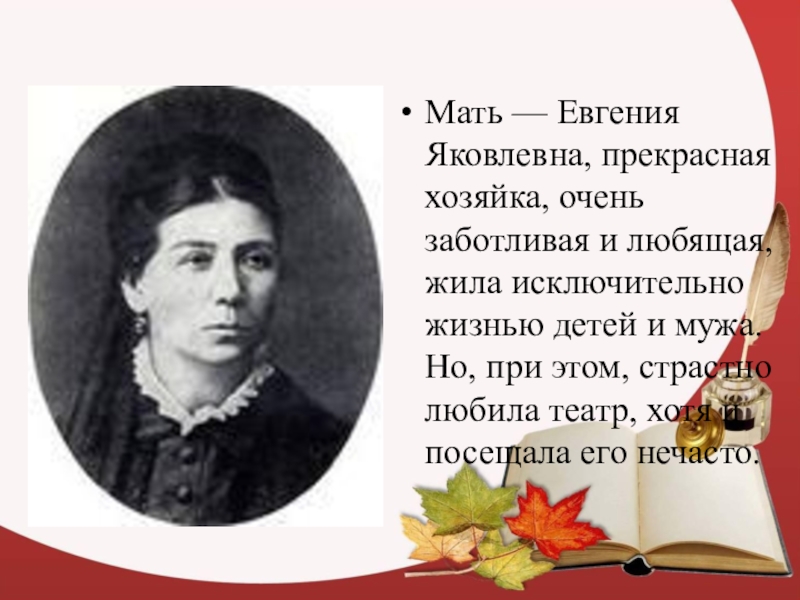 Слайд 3Мать — Евгения Яковлевна, прекрасная хозяйка, очень заботливая и любящая, жила