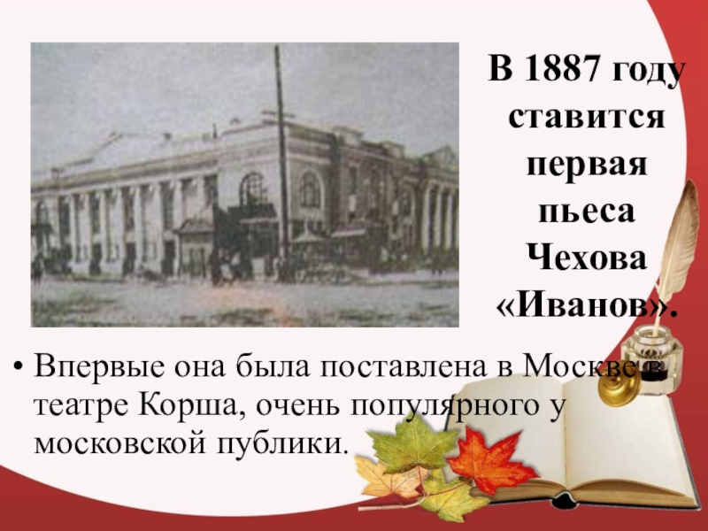 В 1887 году ставится первая пьеса Чехова «Иванов». Впервые она была поставлена в Москве в театре Корша,