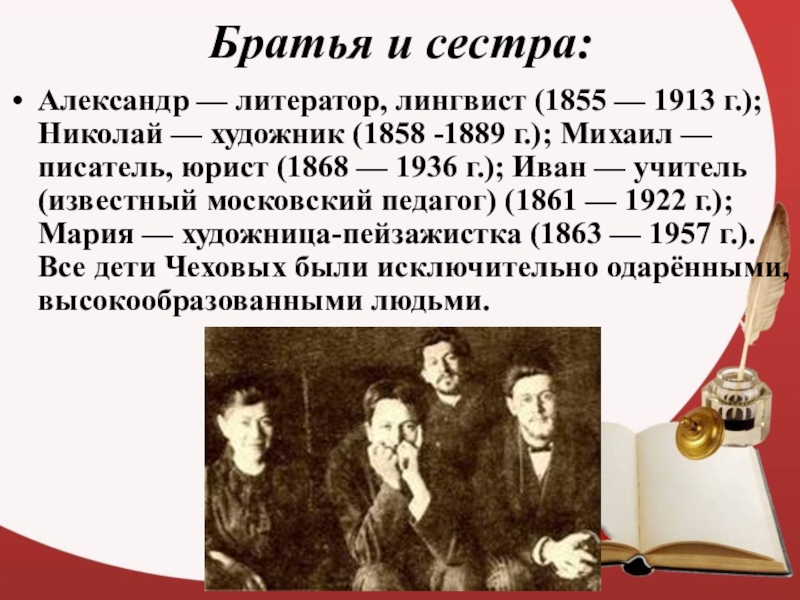 — художник (1858 -1889 г.); Михаил — писатель, юрист (1868 — 1936 г.); Иван — учитель (известный московский педагог) (1861 — 1922 г.); Мария — художница-пейзажистка (1863 — 1957 г.). Все дети Чеховых были исключительно одарёнными, высокообразованными людьми.