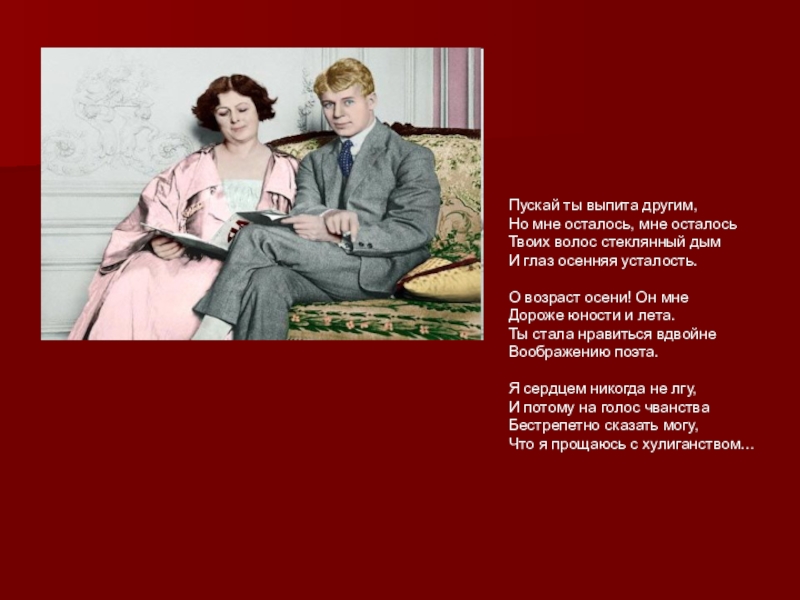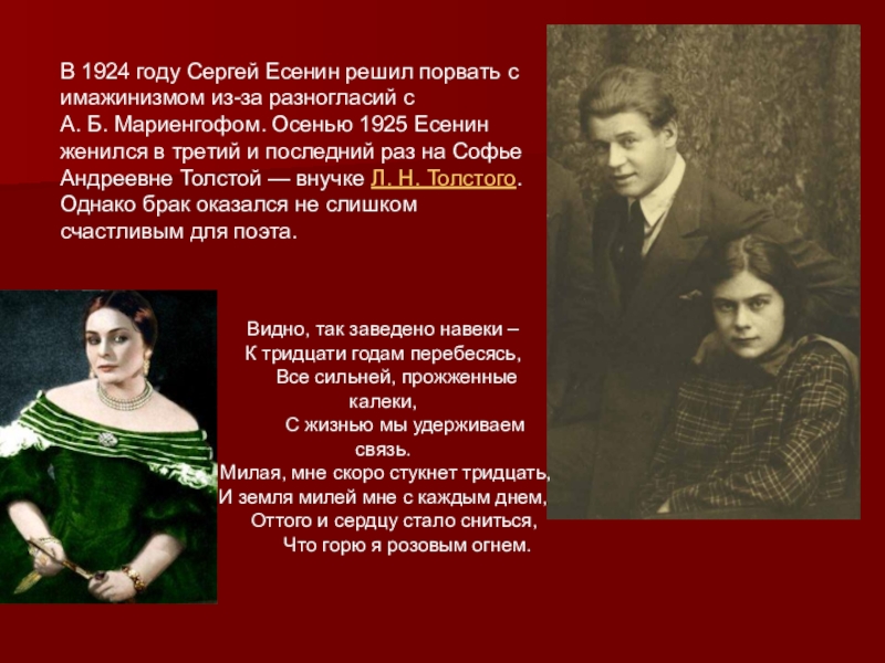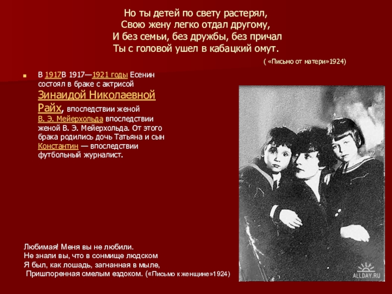 В 1917В 1917—1921 годы Есенин состоял в браке с актрисой Зинаидой Николаевной Райх, впоследствии женой В. Э. Мейерхольда впоследствии женой В. Э. Мейерхольда. От этого брака родились дочь Татьяна и сын Константин — впоследствии футбольный журналист.