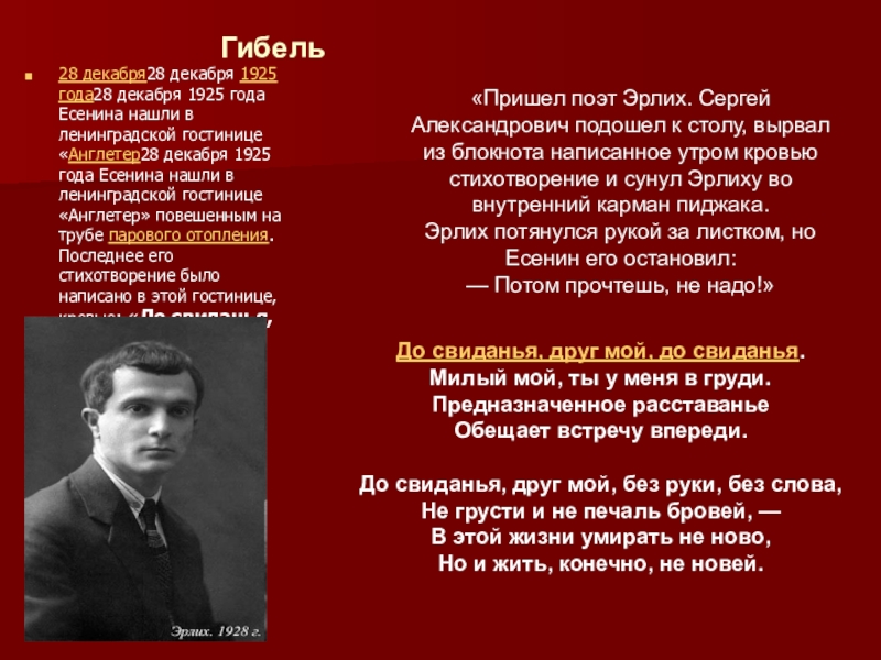 «Пришел поэт Эрлих. Сергей Александрович подошел к столу, вырвал из блокнота написанное утром кровью стихотворение и сунул Эрлиху во внутренний карман пиджака.