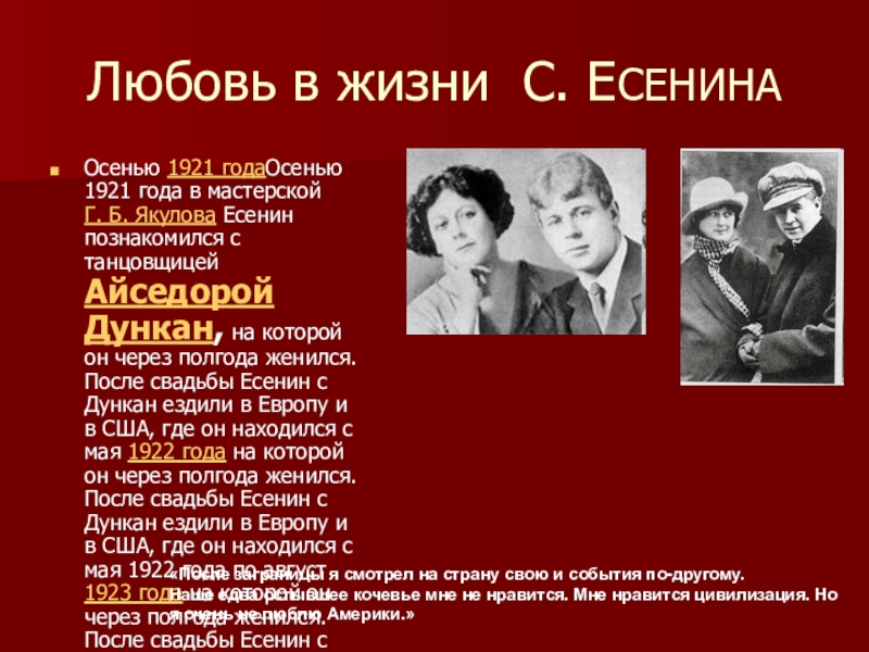 Наше едва остывшее кочевье мне не нравится. Мне нравится цивилизация. Но я очень не люблю Америки.»