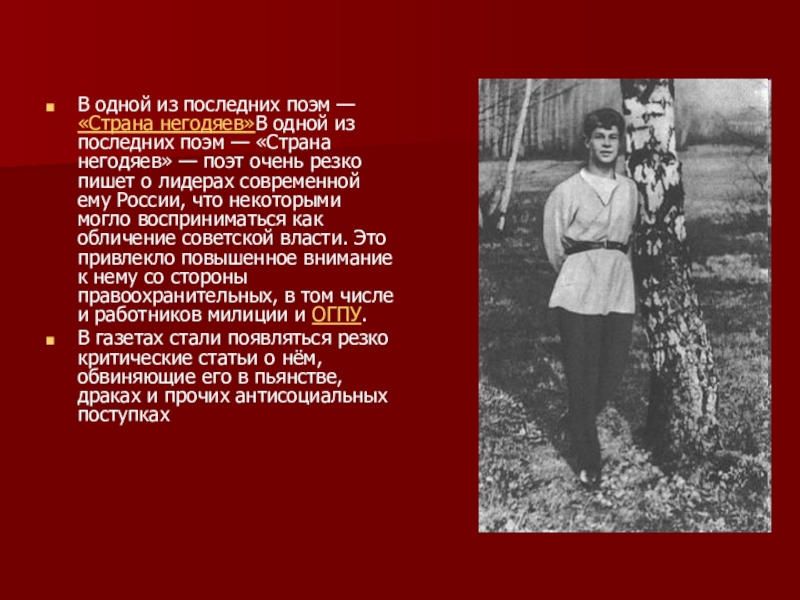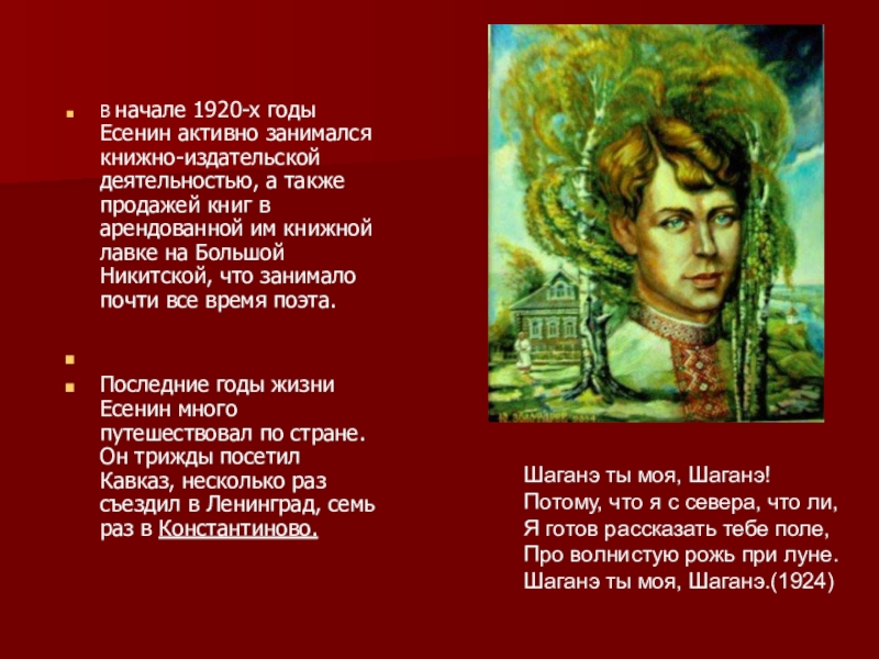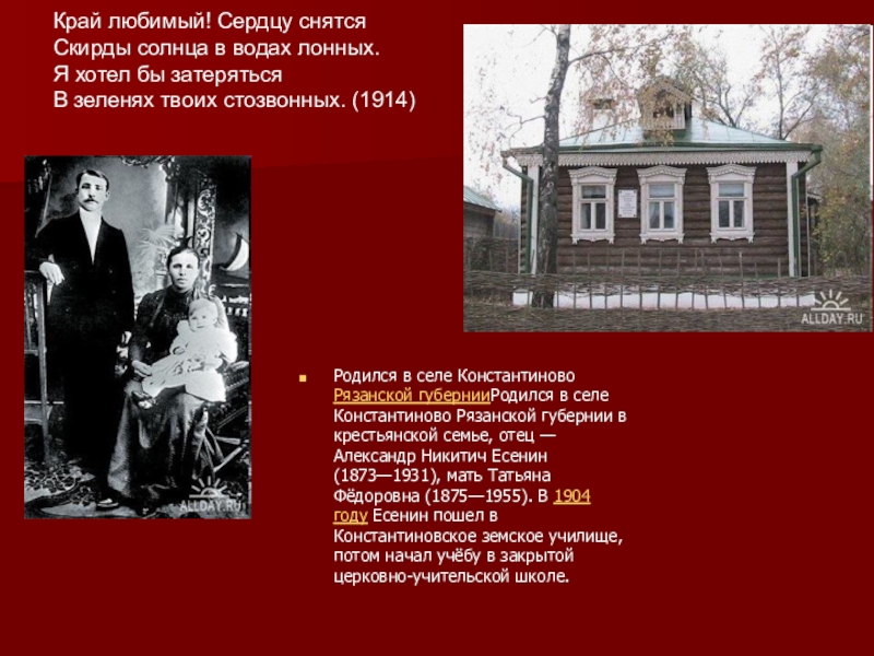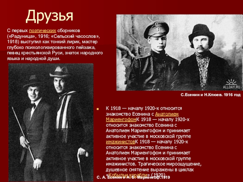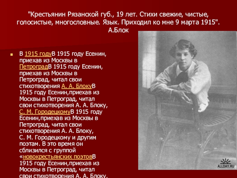 В 1915 годуВ 1915 году Есенин,приехав из Москвы в ПетроградВ 1915 году Есенин,приехав из Москвы в Петроград, читал свои стихотворения А. А. БлокуВ 1915 году Есенин,приехав из Москвы в Петроград, читал свои стихотворения А. А. Блоку, С. М. ГородецкомуВ 1915 году Есенин,приехав из Москвы в Петроград, читал свои стихотворения А. А. Блоку, С. М. Городецкому и другим поэтам. В это время он сблизился с группой «новокрестьянских поэтовВ 1915 году Есенин,приехав из Москвы в Петроград, читал свои стихотворения А. А. Блоку, С. М. Городецкому и другим поэтам. В это время он сблизился с группой «новокрестьянских поэтов» и издал первые сборники («Радуница» — 1916), которые сделали его очень известным. Вместе с Николаем КлюевымВ 1915 году Есенин,приехав из Москвы в Петроград, читал свои стихотворения А. А. Блоку, С. М. Городецкому и другим поэтам. В это время он сблизился с группой «новокрестьянских поэтов» и издал первые сборники («Радуница» — 1916), которые сделали его очень известным. Вместе с Николаем Клюевым часто выступал в стилизованной «народной» одежде, в том числе перед императрицей Александрой ФёдоровнойВ 1915 году Есенин,приехав из Москвы в Петроград, читал свои стихотворения А. А. Блоку, С. М. Городецкому и другим поэтам. В это время он сблизился с группой «новокрестьянских поэтов» и издал первые сборники («Радуница» — 1916), которые сделали его очень известным. Вместе с Николаем Клюевым часто выступал в стилизованной «народной» одежде, в том числе перед императрицей Александрой Фёдоровной и её дочерями в Царском Селе.