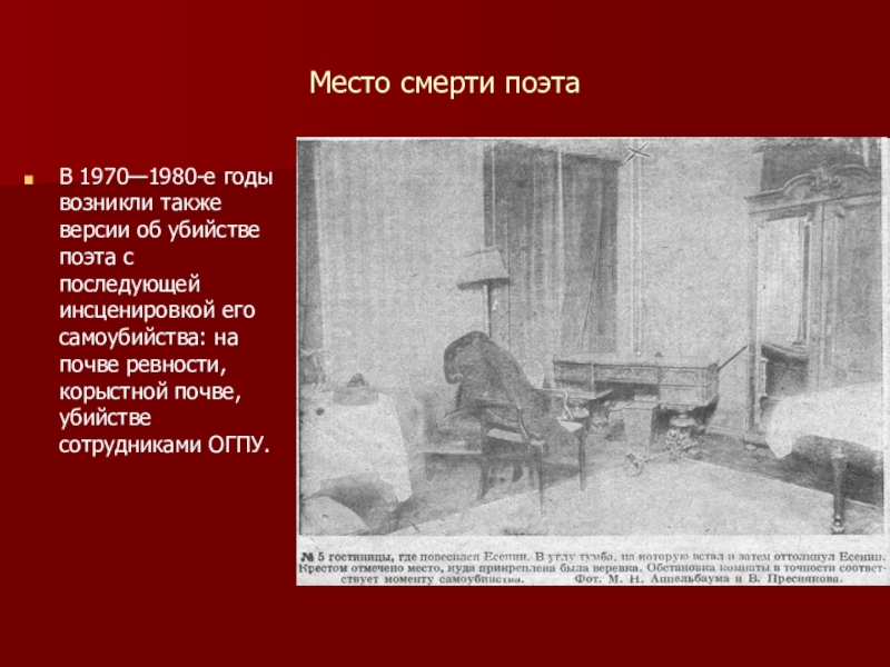 По официальной версии, Есенин в состоянии депрессииПо официальной версии, Есенин в состоянии депрессии покончил жизньсамоубийством(повесился).