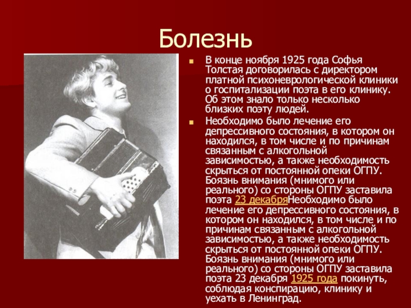В последние месяцы своего трагического существования Есенин бывал человеком не больше одного часа в сутки. От первой, утренней, рюмки уже темнело его сознание. А за первой, как железное правило, шли - вторая, третья, четвертая, пятая... Время от времени Есенина клали в больницу, где самые знаменитые врачи лечили его самыми новейшими способами. Они помогали так же мало, как и самые старейшие способы, которыми тоже пытались его лечить." (Мемуары Анатолия Мариенгофа)