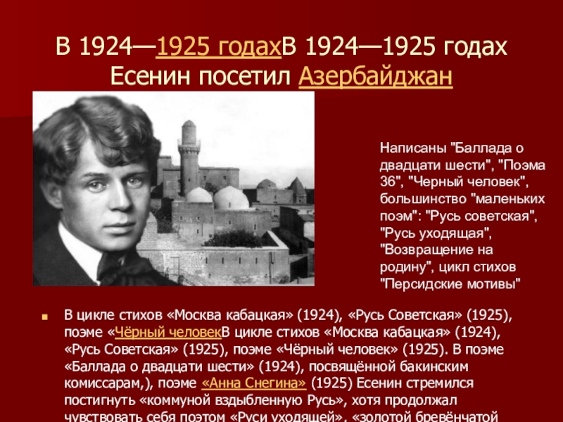 Написаны "Баллада о двадцати шести", "Поэма 36", "Черный человек", большинство "маленьких поэм": "Русь советская", "Русь уходящая", "Возвращение на родину", цикл стихов "Персидские мотивы"