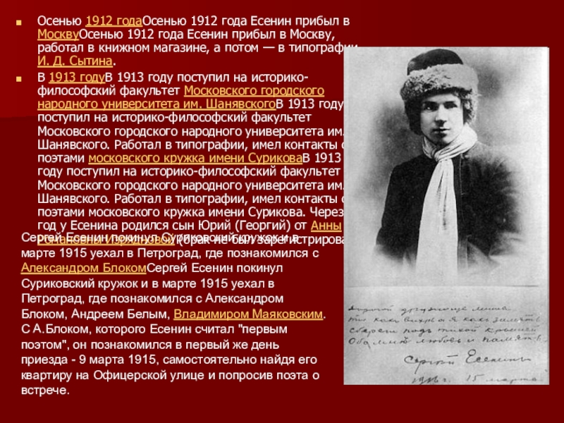Сергей Есенин покинул Суриковский кружок и в марте 1915 уехал в Петроград, где познакомился с Александром БлокомСергей Есенин покинул Суриковский кружок и в марте 1915 уехал в Петроград, где познакомился с Александром Блоком, Андреем Белым, Владимиром Маяковским. С А.Блоком, которого Есенин считал "первым поэтом", он познакомился в первый же день приезда - 9 марта 1915, самостоятельно найдя его квартиру на Офицерской улице и попросив поэта о встрече.