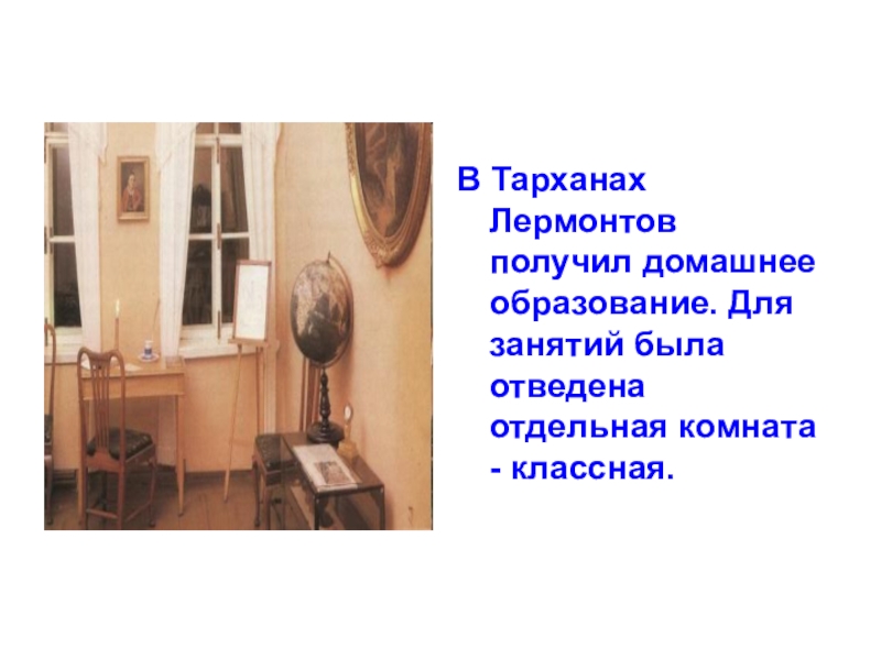 Слайд 8В Тарханах Лермонтов получил домашнее образование. Для занятий была отведена отдельная