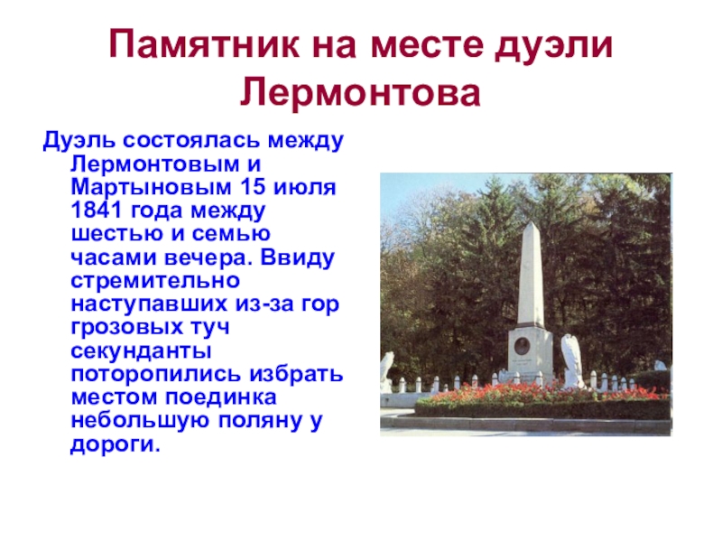 июля 1841 года между шестью и семью часами вечера. Ввиду стремительно наступавших из-за гор грозовых туч секунданты поторопились избрать местом поединка небольшую поляну у дороги.