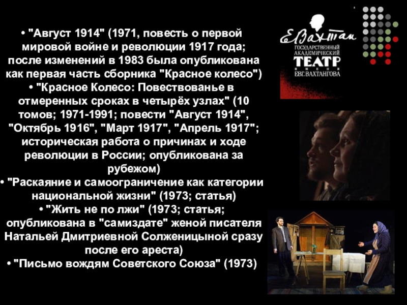 "Красное Колесо: Повествованье в отмеренных сроках в четырёх узлах" (10 томов; 1971-1991; повести "Август 1914", "Октябрь 1916", "Март 1917", "Апрель 1917"; историческая работа о причинах и ходе революции в России; опубликована за рубежом)