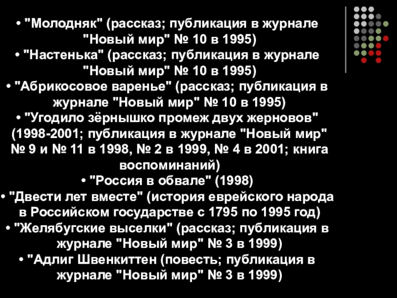 "Угодило зёрнышко промеж двух жерновов" (1998-2001; публикация в журнале "Новый мир" № 9 и № 11 в 1998, № 2 в 1999, № 4 в 2001; книга воспоминаний)