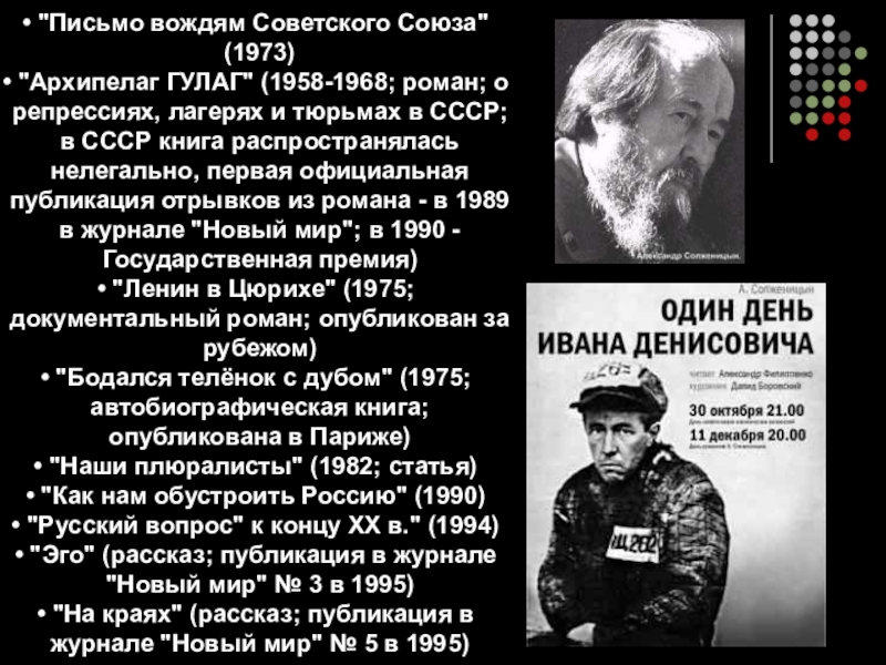 о репрессиях, лагерях и тюрьмах в СССР; в СССР книга распространялась нелегально, первая официальная публикация отрывков из романа - в 1989 в журнале "Новый мир"; в 1990 - Государственная премия)