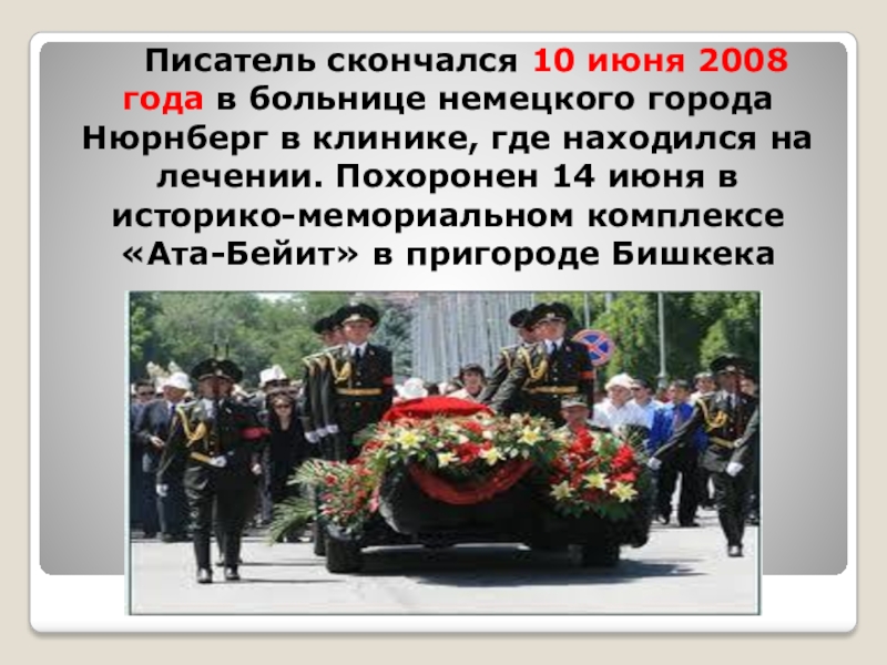 Слайд 14 Писатель скончался 10 июня 2008 года в больнице немецкого