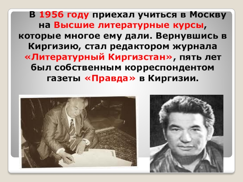 Слайд 9 По окончании Высших литературных курсов Айтматов работал