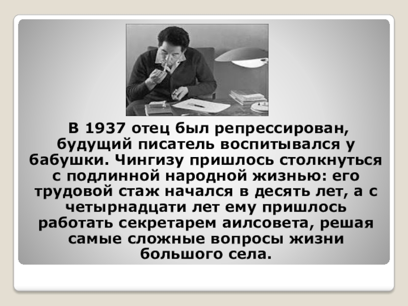 Чингизу пришлось столкнуться с подлинной народной жизнью: его трудовой стаж начался в десять лет, а с четырнадцати лет ему пришлось работать секретарем аилсовета, решая самые сложные вопросы жизни большого села.