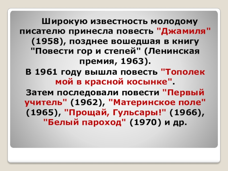 Слайд 6 Широкую известность молодому писателю принесла повесть "Джамиля" (1958), позднее