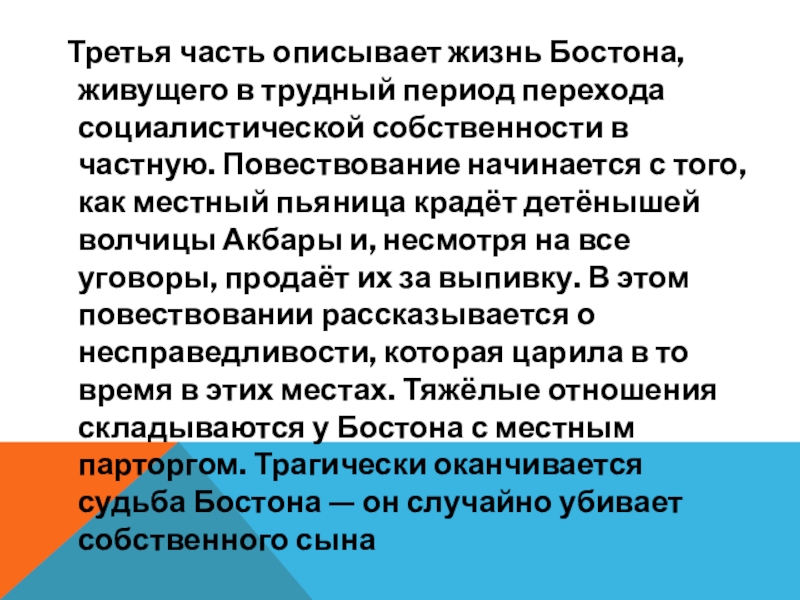 перехода социалистической собственности в частную. Повествование начинается с того, как местный пьяница крадёт детёнышей волчицы Акбары и, несмотря на все уговоры, продаёт их за выпивку. В этом повествовании рассказывается о несправедливости, которая царила в то время в этих местах. Тяжёлые отношения складываются у Бостона с местным парторгом. Трагически оканчивается судьба Бостона — он случайно убивает собственного сына