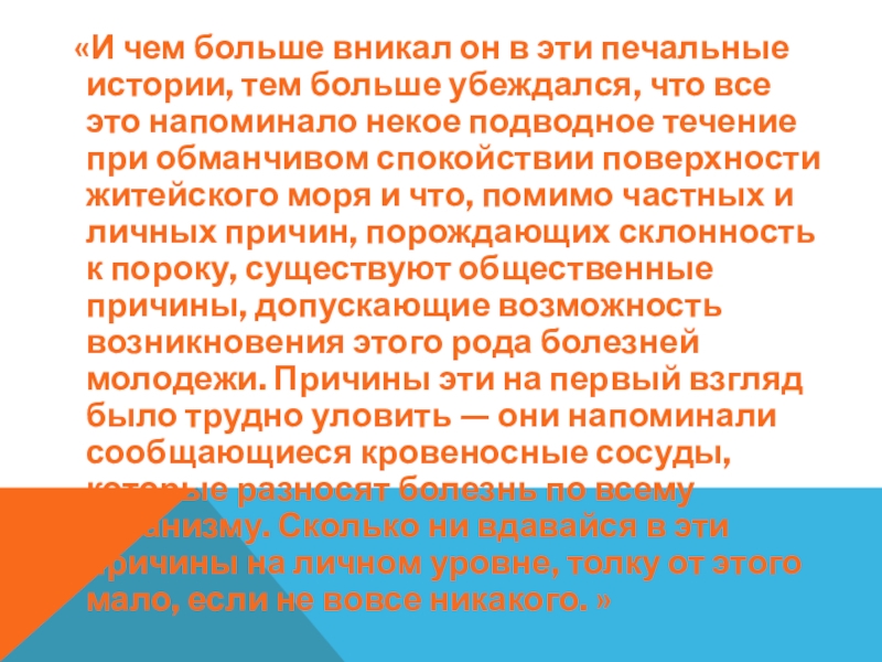 тем больше убеждался, что все это напоминало некое подводное течение при обманчивом спокойствии поверхности житейского моря и что, помимо частных и личных причин, порождающих склонность к пороку, существуют общественные причины, допускающие возможность возникновения этого рода болезней молодежи. Причины эти на первый взгляд было трудно уловить — они напоминали сообщающиеся кровеносные сосуды, которые разносят болезнь по всему организму. Сколько ни вдавайся в эти причины на личном уровне, толку от этого мало, если не вовсе никакого. »