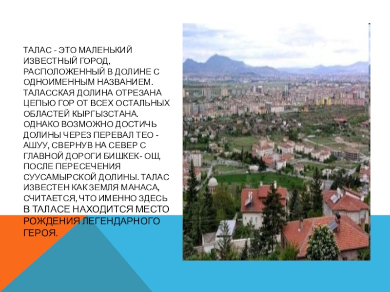 ТАЛАС - ЭТО МАЛЕНЬКИЙ ИЗВЕСТНЫЙ ГОРОД, РАСПОЛОЖЕННЫЙ В ДОЛИНЕ С ОДНОИМЕННЫМ