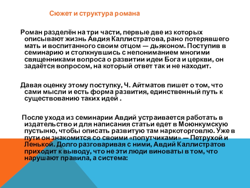 После ухода из семинарии Авдий устраивается работать в издательство и для написания статьи едет в Моюнкумскую пустыню, чтобы описать развитую там наркоторговлю. Уже в пути он знакомится со своими «попутчиками» — Петрухой и Ленькой. Долго разговаривая с ними, Авдий Каллистратов приходит к выводу, что не эти люди виноваты в том, что нарушают правила, а система: