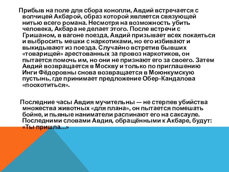 волчицей Акбарой, образ которой является связующей нитью всего романа. Несмотря на возможность убить человека, Акбара не делает этого. После встречи с Гришаном, в вагоне поезда, Авдий призывает всех покаяться и выбросить мешки с наркотиками, но его избивают и выкидывают из поезда. Случайно встретив бывших «товарищей» арестованных за провоз наркотиков, он пытается помочь им, но они не признают его за своего. Затем Авдий возвращается в Москву и только по приглашению Инги Фёдоровны снова возвращается в Моюнкумскую пустынь, где принимает предложение Обер-Кандалова «поохотиться».