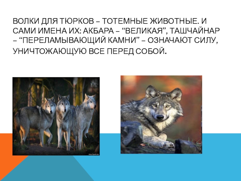 Слайд 12ВОЛКИ ДЛЯ ТЮРКОВ – ТОТЕМНЫЕ ЖИВОТНЫЕ. И САМИ ИМЕНА ИХ: АКБАРА
