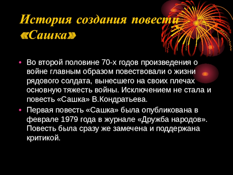 главным образом повествовали о жизни рядового солдата, вынесшего на своих плечах основную тяжесть войны. Исключением не стала и повесть «Сашка» В.Кондратьева.
