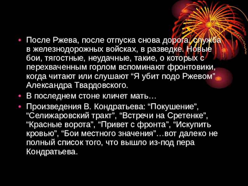 Произведения В. Кондратьева: “Покушение”, “Селижаровский тракт”, “Встречи на Сретенке”, “Красные ворота”, “Привет с фронта”, “Искупить кровью”, “Бои местного значения”…вот далеко не полный список того, что вышло из-под пера Кондратьева.