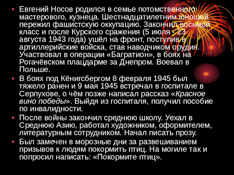 Слайд 16Евгений Носов родился в семье потомственного мастерового, кузнеца. Шестнадцатилетним юношей пережил