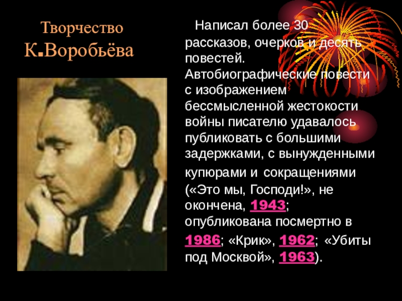 десять повестей. Автобиографические повести с изображением бессмысленной жестокости войны писателю удавалось публиковать с большими задержками, с вынужденными купюрами и сокращениями («Это мы, Господи!», не окончена, 1943; опубликована посмертно в 1986; «Крик», 1962; «Убиты под Москвой», 1963).