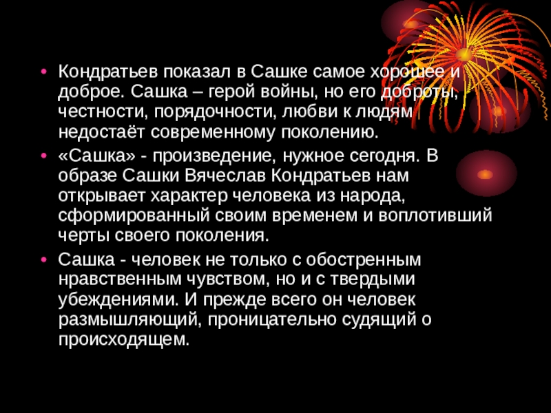 Слайд 14Кондратьев показал в Сашке самое хорошее и доброе. Сашка – герой