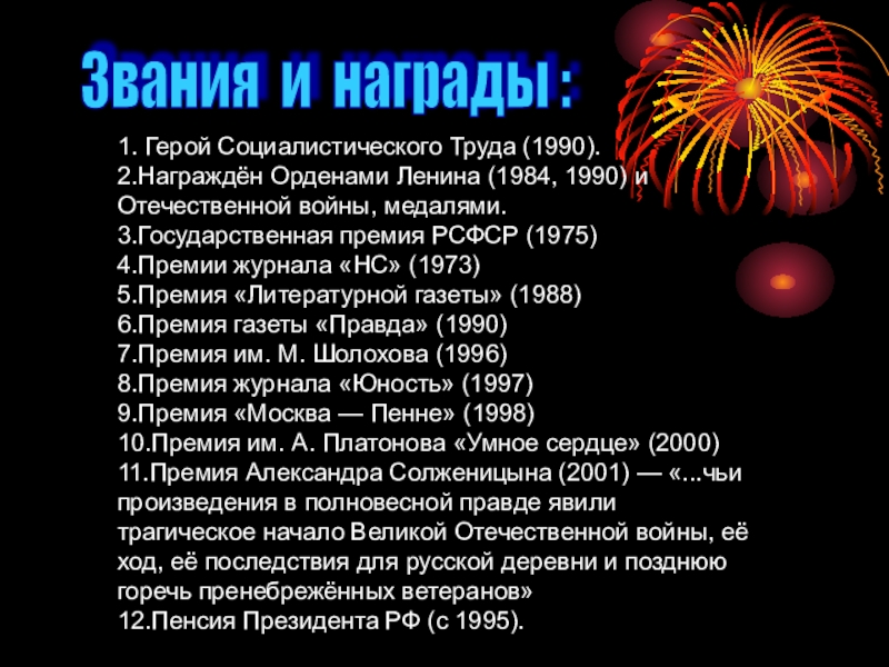11.Премия Александра Солженицына (2001) — «...чьи произведения в полновесной правде явили трагическое начало Великой Отечественной войны, её ход, её последствия для русской деревни и позднюю горечь пренебрежённых ветеранов»