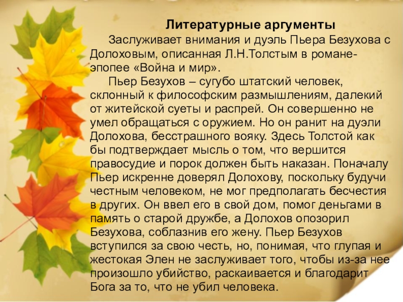 Пьер Безухов – сугубо штатский человек, склонный к философским размышлениям, далекий от житейской суеты и распрей. Он совершенно не умел обращаться с оружием. Но он ранит на дуэли Долохова, бесстрашного вояку. Здесь Толстой как бы подтверждает мысль о том, что вершится правосудие и порок должен быть наказан. Поначалу Пьер искренне доверял Долохову, поскольку будучи честным человеком, не мог предполагать бесчестия в других. Он ввел его в свой дом, помог деньгами в память о старой дружбе, а Долохов опозорил Безухова, соблазнив его жену. Пьер Безухов вступился за свою честь, но, понимая, что глупая и жестокая Элен не заслуживает того, чтобы из-за нее произошло убийство, раскаивается и благодарит Бога за то, что не убил человека.