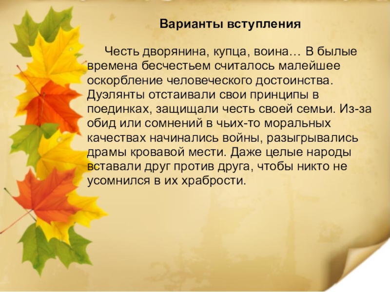 все времена? О ней говорит народная мудрость – «Береги честь смолоду», ее воспевают поэты и размышляют философы. За нее умирали на дуэлях, а, потеряв ее, считали жизнь конченой. В любом случае, в понятии честь заложено стремление к нравственному идеалу. Этот идеал может создать человек сам для себя, а может и принять от общества.
