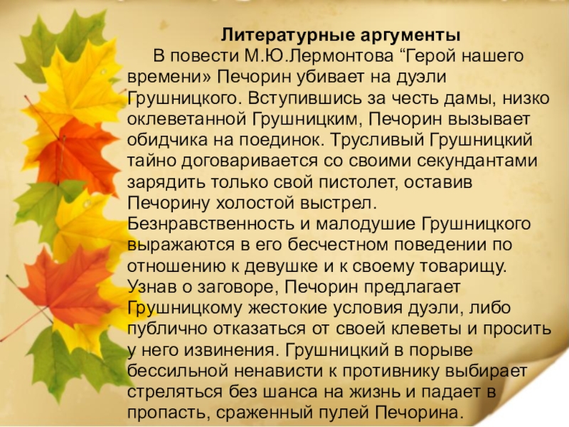 Грушницкого. Вступившись за честь дамы, низко оклеветанной Грушницким, Печорин вызывает обидчика на поединок. Трусливый Грушницкий тайно договаривается со своими секундантами зарядить только свой пистолет, оставив Печорину холостой выстрел. Безнравственность и малодушие Грушницкого выражаются в его бесчестном поведении по отношению к девушке и к своему товарищу.