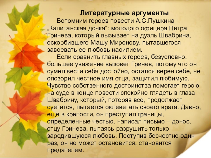 Чувство собственного достоинства помогает герою на суде в конце повести спокойно глядеть в глаза Швабрину, который, потеряв все, продолжает суетится, пытается оклеветать своего врага. Давно, еще в крепости, он преступил границы, определенные честью, написал письмо – донос, отцу Гринева, пытаясь разрушить только зародившуюся любовь. Поступив бесчестно один раз, он не может остановится, становится предателем.